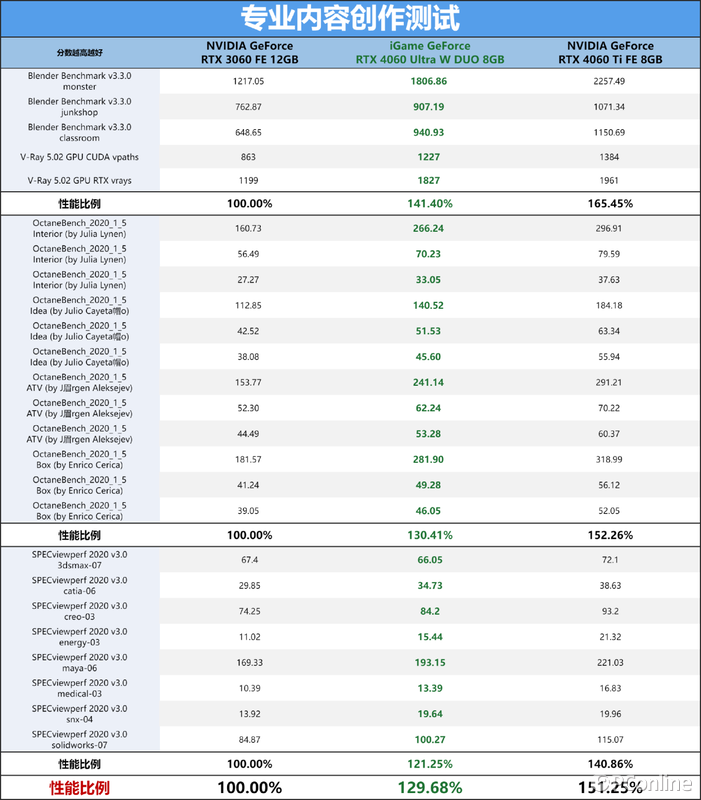 而来到专业内容创作测试方面就是RTX 40系列显卡的天下,iGame RTX 4060 Ultra W性能领先于RTX 3060 12GB显卡约130%,尤其是Blender渲染测试更是达到了141%的领先幅度。