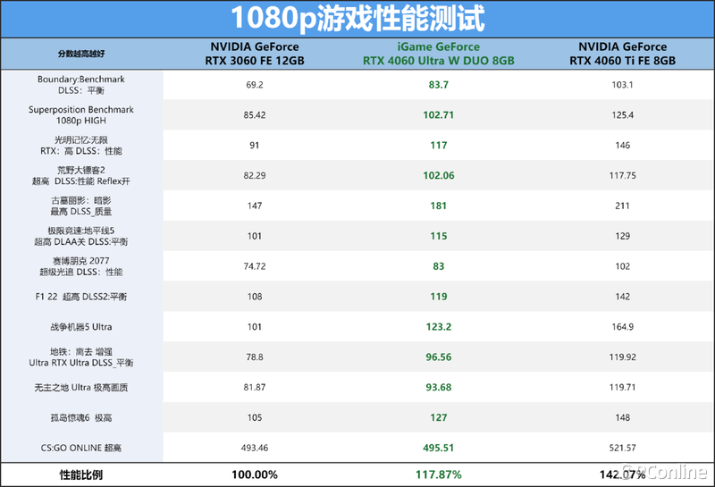 而相较于上代RTX 3060 12GB显卡,iGame RTX 4060 Ultra W显卡有着117.87%性能提升,其中支持DLSS技术游戏提升最大。不过若你是拿来玩CS:GO这种低显卡需求的游戏,那这两者差异是不大的。