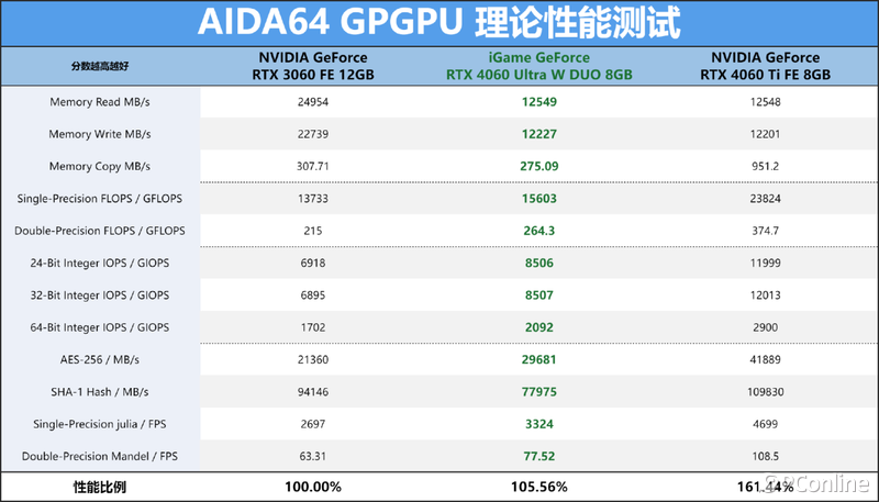 3DMARK理论性能测试更多的是反应理论游戏中的表现,而我们想知道显卡的运算能力表现如何,那么就得来看看AIDA64 GPGPU测试了。从结果导向来看,iGame RTX 4060 Ultra W看着只提升了5%不到,实际上并非如此:RTX 4060 8G显存读写受到了显存位宽的限制,单纯的显存读写速度是比不上RTX 3060 12GB,这部分会直接影响到GPGPU整个性能比例。