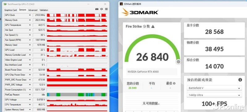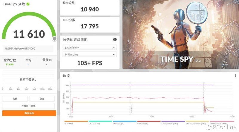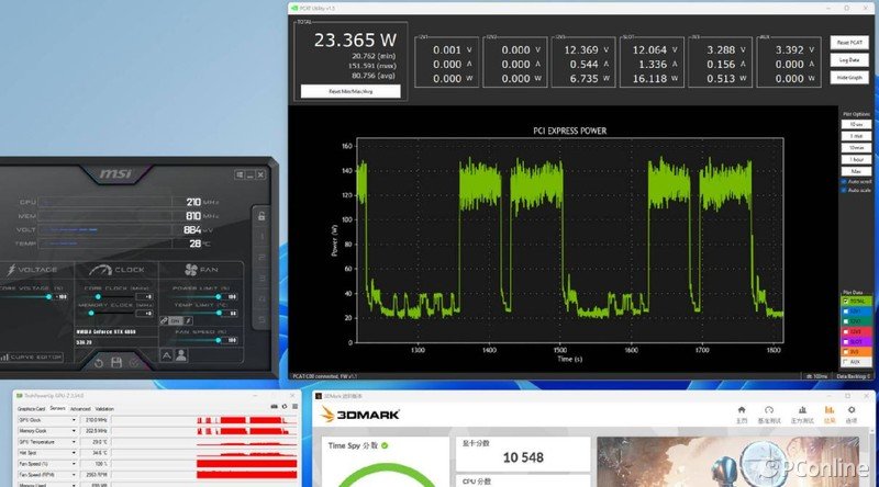 这样我们在超频前,让把电压+100%,功耗与温度限制全拉满,以及风扇转速也全拉满,iGame RTX 4060 Ultra W在Time Spy显卡分数为10548,但PCAT监控到的功耗已经达到151W。