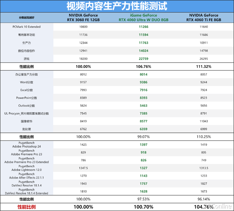 而如果我们单看显卡的算力,那么iGame RTX 4060 Ultra W显卡性能同样是RTX 3060 12GB显存的19%。这是得益于ADA GPU架构带来的性能提升,RTX 40系列在运算能力方面的确比上代产品好不少。