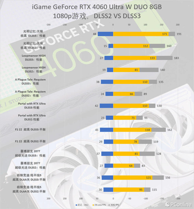 在同分辨率,同画质设计下,我们分别对iGame RTX 4060 Ultra W显卡进行的DLSS2与DLSS3游戏流畅度变化的对比,可看出来DLSS3对帧数的提升还是比较明显的,平均下来约有38%的游戏流畅度提升。另外不单是平均游戏帧数有提升,1% LOW帧数同样提升较为明显,而且之后也会有越来越多支持DLSS3黑科技的游戏,RTX 4060 8GB相信之后会成为游戏玩家首选的2千元档显卡之一。