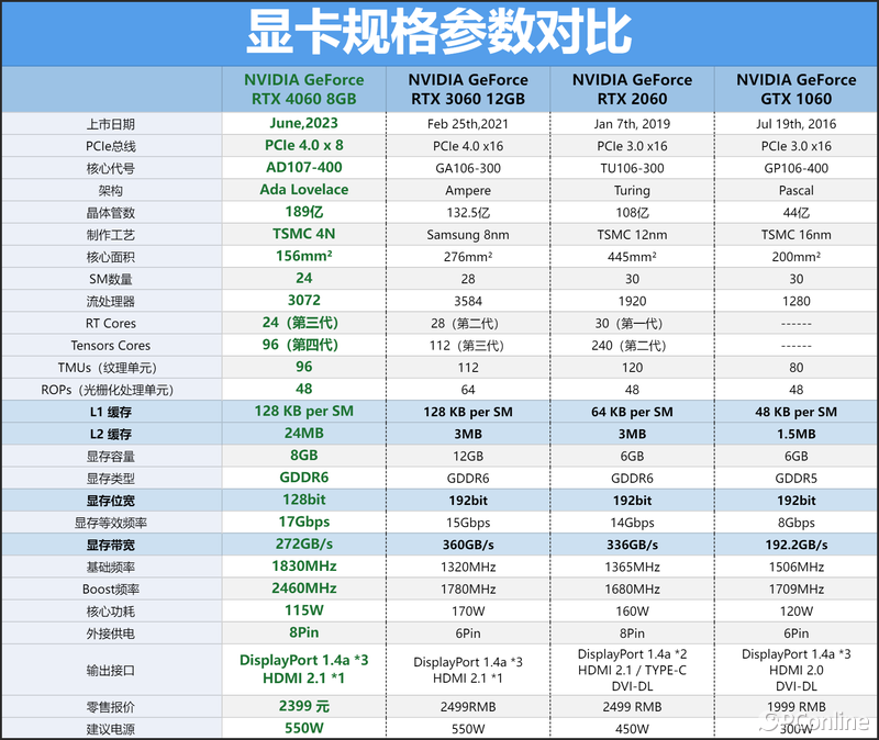 核心面积小并不代表其规格就会弱,从规格上来看,RTX 4060可以说是这几代60系列显卡中晶体管数量最多的一个,得益于TSMC 4N工艺才把核心面积与功耗控制下去,这样RTX 4060 TDP功耗重回到115W水平,与当年的GTX 1060 120W TDP相当。