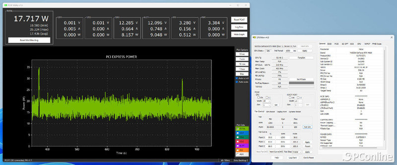 当然由于GPU-Z对RTX 4060 8G显卡的功耗支持度并不高,只有BPD与GPU CPD功耗表现,我们并不能很好地观察到显卡的PCIe SLOT与8Pin辅助供电的功耗情况,于是我们使用上最新一代的NVIDIA PCAT V2工具套件进行实时监控。