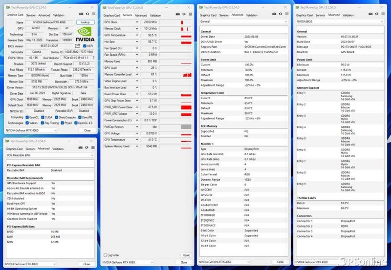 测试前刚好更新了GPU-Z版本,可以更完整的查看到iGame RTX 4060 Ultra W GPU信息与BIOS信息,频率1830MHz,Boost频率2460,显存频率17GHz,这些常规的参数与RTX 4060 8G标准版本是一致的。