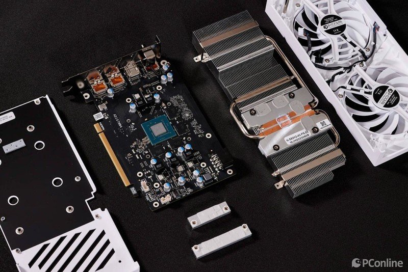 iGame RTX 4060 Ultra W显卡全拆解,经典的三明治结构:金属底板、显卡PCB、散热主体,以及双风扇。比较特别的是供电部分是由两块小散热片进行辅助散热。