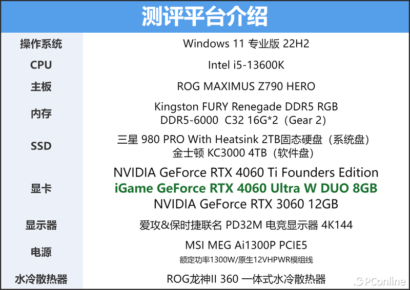 测试前我们还是得介绍一下,此次iGame RTX 4060 Ultra W显卡所使用的测试平台。处理器我们不再RTX 4060 Ti首发当时所采用的i9-13900KS处理器,毕竟 RTX 4060 8G其实就是中端显卡,一般购买此款显卡的用户不会购买这么贵的处理器(特殊需求除外),那么我们此次就使用上i5-13600K处理器也足够,测试出来的成绩更为接近真实用户到手时的性能表现。