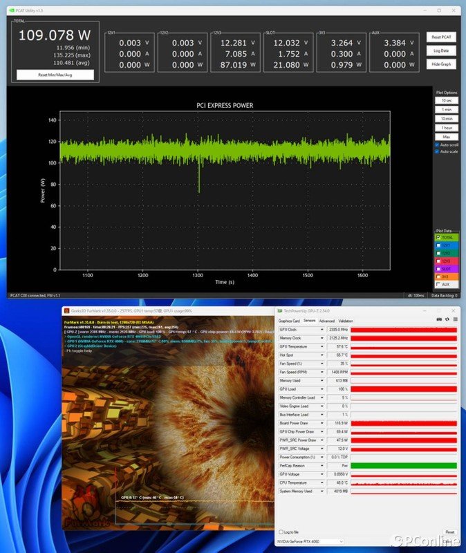 而由于GPU-Z上并没有PCIe SLOT插槽与8Pin辅助供电的功耗情况,PCAT V2工具则可以很好地监控出来,整个Furmark过程中,+12V 8Pin辅助供电为87W,PCIe SLOT插槽为21W,这样真的如我们之前即使是旧平台升级新iGame RTX 4060 Ultra W显卡也不用更换电源了。