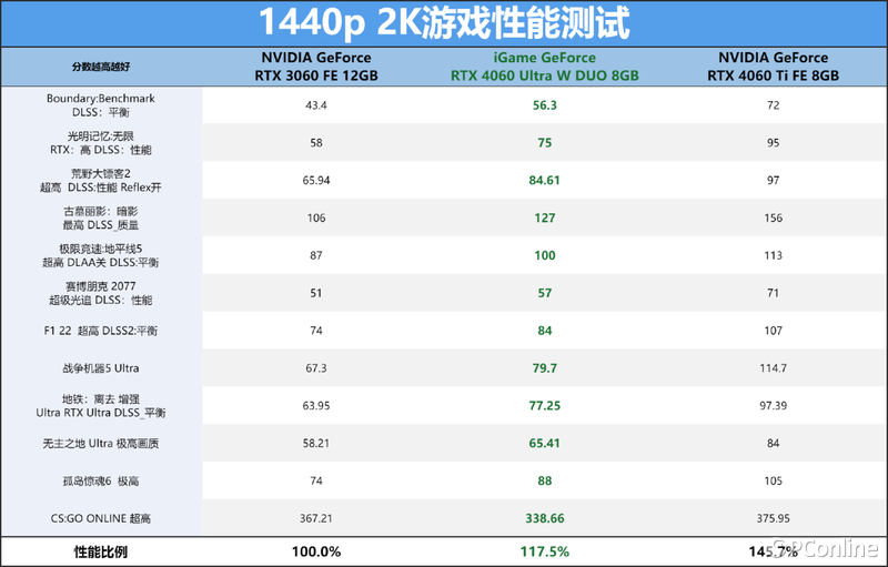 虽然iGame RTX 4060 Ultra W显卡是一款针对1080p高帧数的游戏显卡,但并非代表着其没有2K游戏的能力,同画质设定下,我们再测试一轮,iGame RTX 4060 Ultra W显卡的2K游戏性能同样是比较给力的,除了部分基本60FPS+的游戏流畅度是完全没问题的。