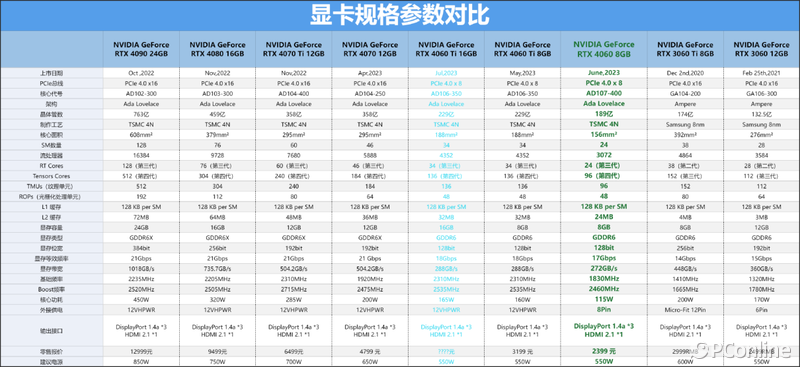 NVIDIA GeForce RTX 40系列显卡规格对比,原图点击放大