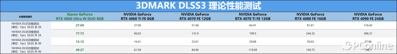 当然如果你拿iGame RTX 4060 Ultra W显卡玩游戏,怎么可能少得到了支持独家DLSS3技术呢。从3DMARK DLSS理论性能来看,iGame RTX 4060 Ultra W显卡在2K分辨率的DLSS功能测试关闭DLSS3情况下只有27.69 FPS,而开启DLSS3技术后,游戏流畅度翻了翻,能达到77.73 FPS。对比一下大哥RTX 4060 Ti 8GB,相差25%,那还真可以了。