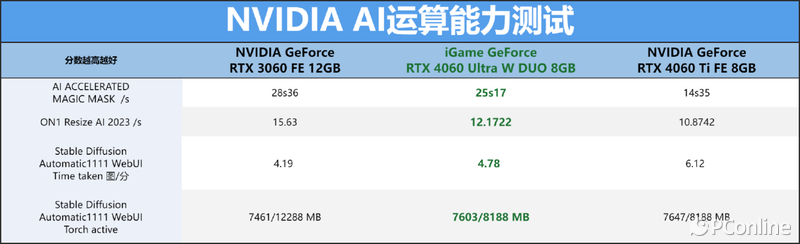 显卡Ai性能测试是近几次显卡首发的时候增加的,目前包括了达芬奇的Magic Mask测试,On1 Resize AI 2023的Resize 200%放大测试,以及近期较火的Stable Diffusion Automatic1111 WebUI 生成图片测试。从结果来看,iGame RTX 4060 Ultra W小幅度地领先于RTX 3060 12GB显卡,而且其最大显存占用也不超越8GB,刚好满足主流Ai应用。