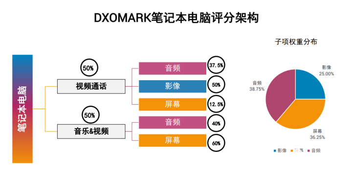 为了评估笔记本电脑的性能表现,DXOMARK选择专注于其专业领域的三个核心要素:影像、音频和屏幕,并且将打分分为视频通话和音乐和视频,结合两个项目的分数再综合给出一个产品整体得分。希望透过打分排名,为消费者做出正确的购买决策。