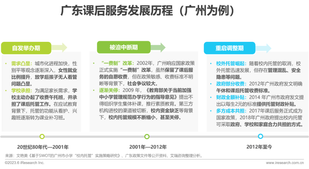 广东的课后服务同样起源于放学后孩子无人看管的社会需求,由校内托管逐渐演变而来,并经历了政策影响下的中断与重启。20世纪80年代,在社会需求诞生后,广东政府及学校承担起了有偿午休和托管的职责,尽管存在卫生、学生负担等问题,但基本满足了家长的托管需求。2001年之后,政府从遏制乱收费和减轻学生负担出发,加强对校内收费的监管,使得广东的校内托管趋于停滞。2017年,教育部《关于做好中小学生课后服务工作的指导意见》的发布使得课后服务成为国家政策,广东将课后托管正式升级为课后服务,并提供全方位的指导、管理和服务。