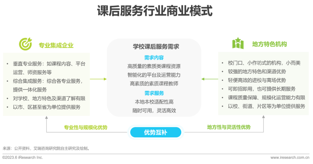 课后服务具有较强的地方属性、线下服务、数字化程度不高的特点,这使得少数远距离的头部企业存在鞭长莫及的难题,而同时各地学校门口存在着大量的小作坊式的课后服务机构,依托其本地特色服务、学校领导的高信任度、轻便高效的进校和离场优势等,可以在学校需要时即招即用,也可提供稳定的长期服务。这使得这类地方机构的灵活性和适应能力更强,在地方灵活游击,长期服务之后,便可以盘踞占领。但同时,受限于企业规模与地方资源,与头部公司相比,跨省、跨市的运营则会显得乏力,同时教研能力、高质量课程也缺乏相应保障。专业集成类的企业与地方特色类的企业在服务规模、教研质量、地方属性等方面存在着短板互补的空间和可能,若能将二者的优势结合,或能成为行之有效的商业模式。