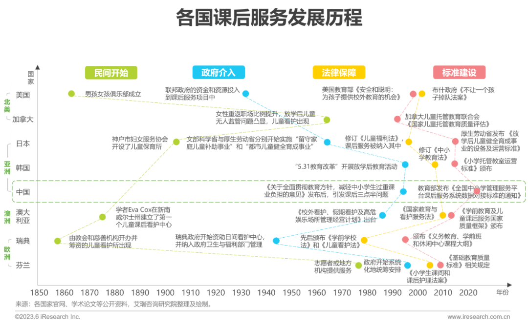 美国、澳大利亚、瑞典的课后服务在19世纪下半叶萌芽于民间力量中,起步较早,相应的其政府能力介入也较早。而各国家的相关立法时间大多徘徊在19世纪末二十世纪初,其中澳大利亚、瑞典、芬兰都颁布了更具针对性的独立法案,步伐相对超前。在立法后,各国均相继推出课后服务的质量评估和监管标准,不断完善。在亚洲国家中,日本的起步时间最早,服务体系也更为成熟,而中国当前相关法律保障和评价标准均有待明确和完善,处于发展早期阶段。