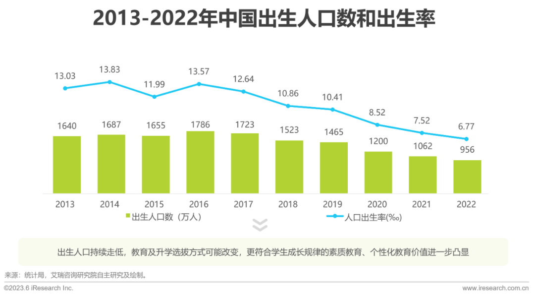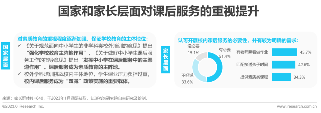 近年来,中国出生人口持续走低,2022年更是跌破了千万大关。随着适龄儿童数量的减少,可能带来教育及升学选拔方式的转变,素质教育、个性化教育落地的可能性提升。从国家层面来看,《关于规范面向中小学生的非学科类校外培训的意见》和《关于做好中小学生课后服务工作的指导意见》两文推动下,课后服务逐渐确立素质教育主阵地的定位。同时,“双减”前校外学科培训挑战校内主体地位,校内课后服务已成为“双减”政策落地的重要载体。从家长层面来看,过半数的家长明确认可课后服务开展的必要性,并希望通过课后服务解决“照看孩子写作业”、“匹配接送孩子时间”、“提供素质类课程”等需求。由此,课后服务已成为承接素质教育、“双减”落地、家长需求的集合体。