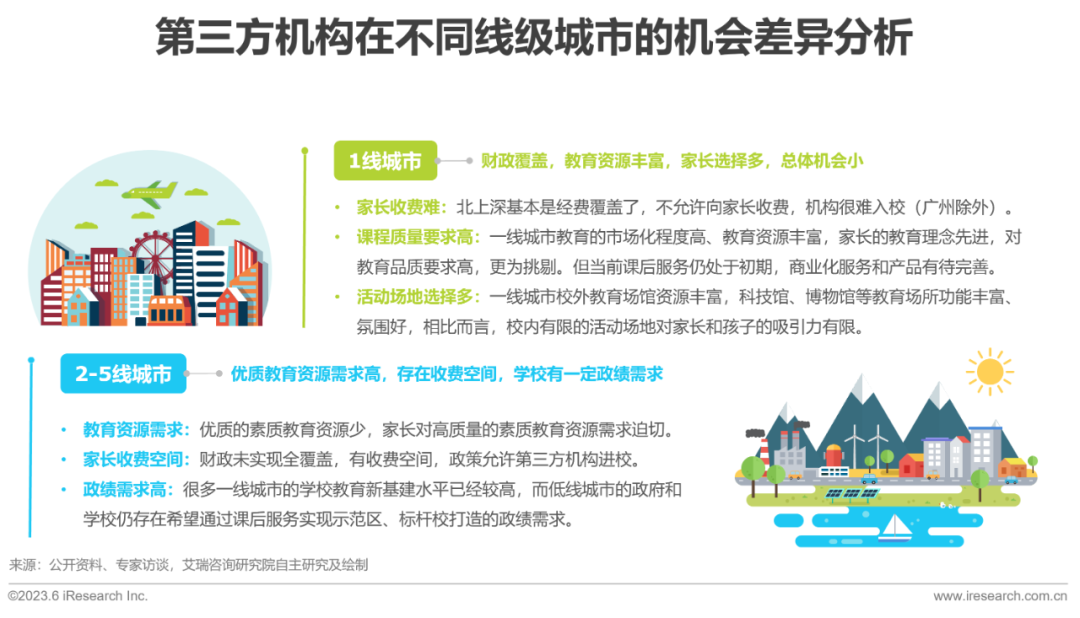 课后服务行业当前在各地区的发展较不均衡,从前述的地区参与率分布也可见一斑。作为典型的“政府生意”,除渠道建设和政企关系外,客观上不同地区对于第三方机构进校的开放度和商业机会本就存在差异。具体来看,作为一线城市的北上深基本实现了财政全覆盖,机构缺乏收费空间,同时这类地区的教育资源和校外场所丰富,家长对教育服务的要求较高。课后服务作为新生事物,产品及服务仍待完善。而二至五线城市则存在优质教育资源需求高和适当的收费空间,同时相比于高线城市学校较高的教育新基建水平,低线城市同时存在一定的政绩需求,政府及学校希望通过课后服务实现示范区、标杆校的打造。