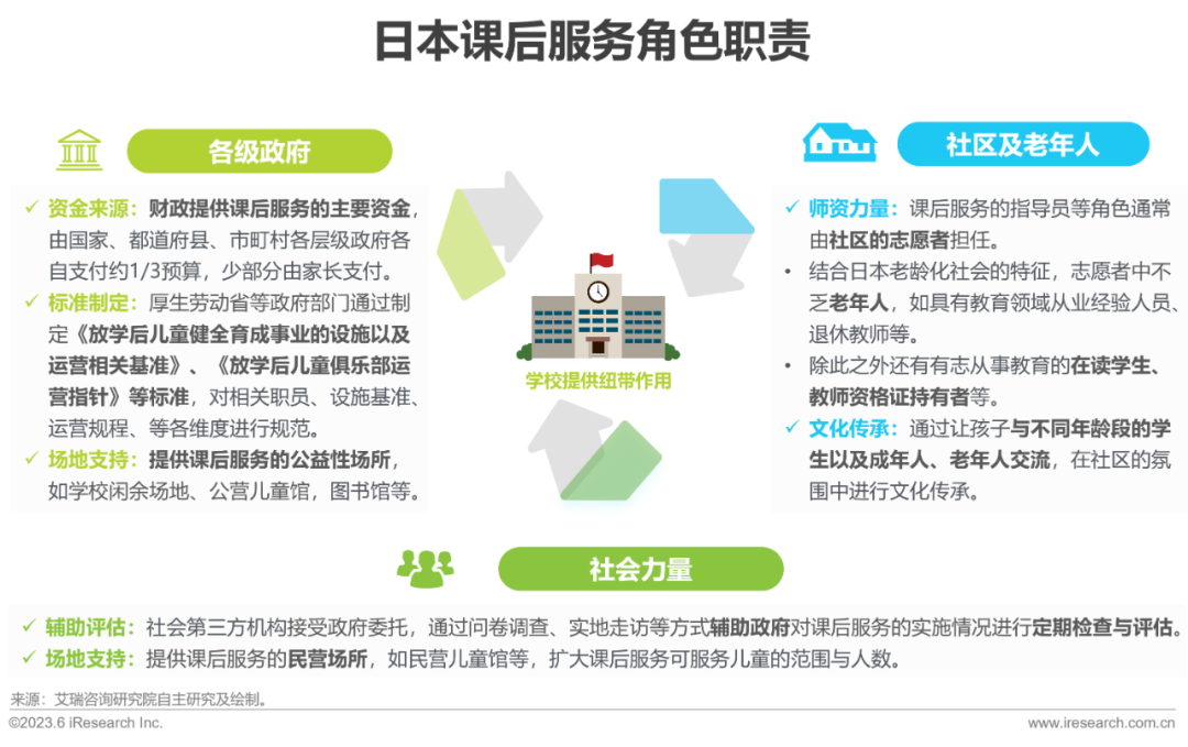 日本课后服务主要由政府与社区承担核心角色与责任,社会提供辅助力量。政府主要负责制定实施标准,提供学校、公营儿童馆等公益性场所,并承担主要资金来源。社区则通过招募符合各类要求的志愿者为课后服务输送主要师资,其中不乏退休教师或具有教育背景的老年人。社会主要通过提供检查与评估服务、提供民营场所等方式,为课后服务事业提供辅助性帮助。