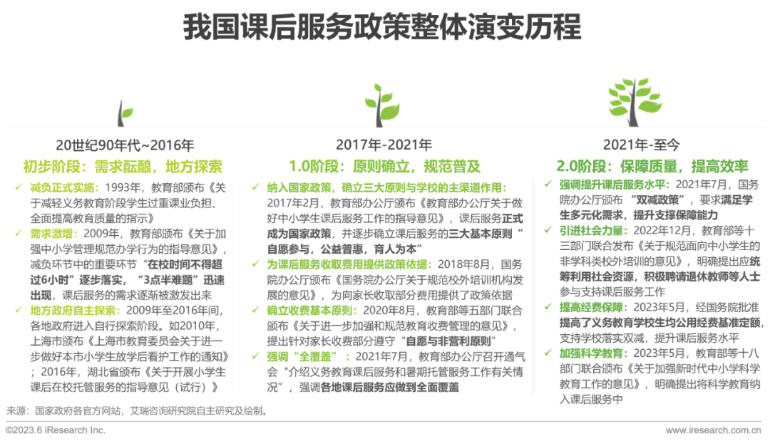20世纪90年代,应试教育的弊端逐渐凸显,素质教育推进力度逐渐加大,中小学减负问题的治理逐步落地。2009年,在“在校时间不得超过6小时”的政策要去下,课后服务的需求被“3点半难题”正式激发出来,各地方政府开始自行探索。2017年2月,课后服务正式成为国家政策并进入1.0发展阶段,逐步确立三大基本原则“自愿参与,公益普惠,育人为本”,并开始对收费、覆盖率方面提出标准,课后服务逐步规范普及化。2021年7月,随着“双减”政策的落地,课后服务进入2.0阶段,政策针对课后服务内容的多元化、社会资源的利用等方面提出进一步的要求,保障提效成为目前我国课后服务领域的发展重点。