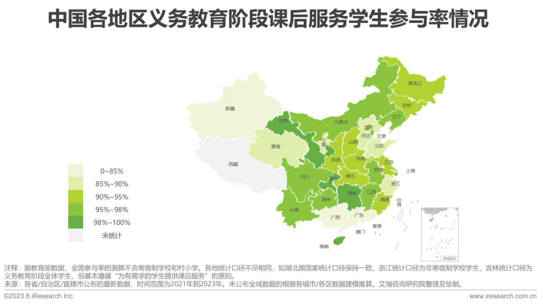 •2022年全国学生参与率达92.2%,但存在较为明显的地方性差异,同时高低线城市的开放度和商业机会也差异较大。其中广东因市场化成熟、制度建设更加规范、家长认可并广泛参与等因素,课后服务处于国内领先水平。