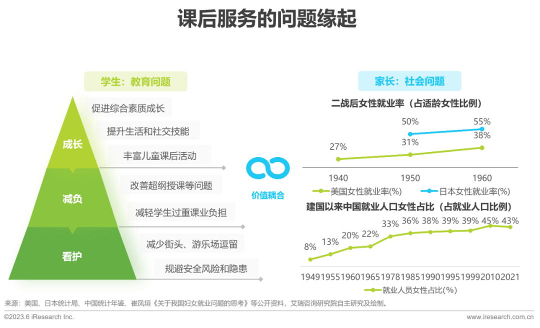 •课后服务不是单独的教育问题,而是教育和社会问题价值耦合的产物。学生已下课而家长尚未下班,这一“间隔时间”的存在,催生了学生和家长双方的需求。学生的需求在于安全看护、课业减负与综合成长,家长的需求在于从课后看护中解放并安心工作。
