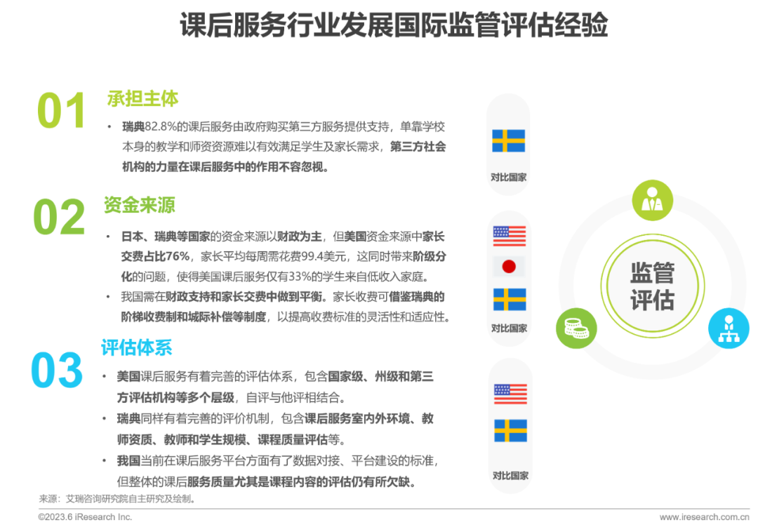 •学习国际经验:我国在课程建设方面应当提升教育属性,深化素质教育实践,挖掘社区力量等社会师资,同时在监管评估方面,应当积极引进第三方机构,平衡家长与财政支出,完善评估体系。