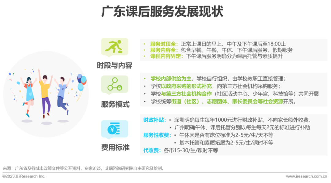 2018年,广东发布《关于做好中小学生校内课后服务工作的指导意见》,随后广东各市相继发布相关政策,将校内课后托管升级为课后服务,从服务时间、服务对象、服务模式、服务内容、保障机制等方面提出指导意见和工作指引。具体来看,广东课后服务的时间长、内容丰富,包含正常上课日从早餐到下午课后服务;其次,广东的课后服务主体明确,权责相对清晰,服务模式成熟;同时,广东课后服务的费用标准较高,含财政补贴、服务性收费和代收费三种,如深圳基本实现财政全覆盖,同时广东的第三方机构代收费标准也高于全国水平。
