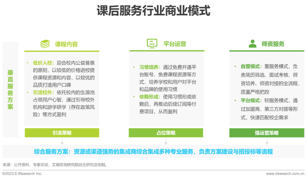 当前课后服务行业仍处于发展早期,从垂直服务来看,课程内容进校、平台运营占位、师资服务连接都处于早期圈地占领阶段。在当下资金有限、使用规则不明的背景下,通过低价、免费的方式占领用户心智、培养用户习惯则成为有效的策略,进而谋求后续的付费和盈利,但这种模式当前存在一定的政策风险。而师资服务重运营能力,分为自营模式和平台模式,更考验稳定的师资来源和高水平的师资素养。如果说垂直服务更考验与校局的客情关系,那么集成的综合服务则更考验与生态伙伴的合作关系,这通常需要一家资源或渠道强势的企业作为集成方,主导综合服务解决方案的建设与招投标等事宜。