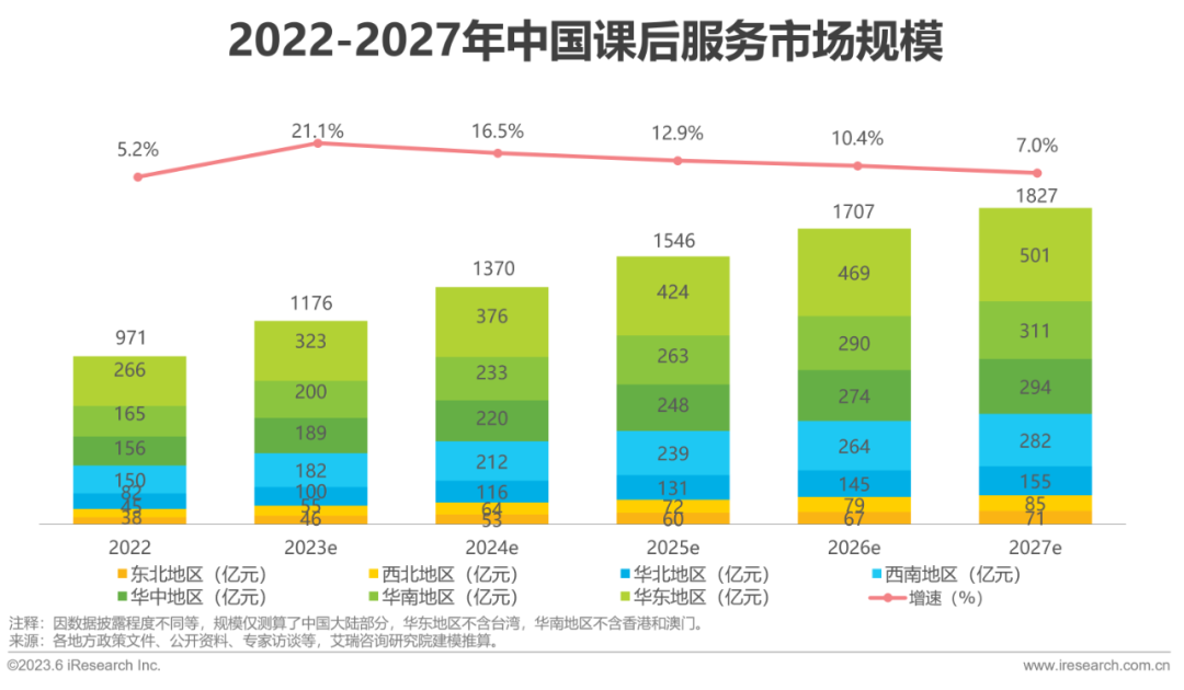 随着疫情影响的逐渐消散,“双减”政策的逐步落地,在“三年内成效显著”的政策要求下,预计2023年课后服务的市场规模将达1176亿。从规模结构来看,课后服务的市场规模分为政府和家长出资两部分,在公益普惠的原则下,采取财政基本保障、家庭适当分担的资金结构。具体来看,政府方面包含各地的专项财政补贴、以及部分生均公用经费,家长方面包含服务性收费和代收费。从地区分布来看,华东和华南地区由于财政扶持力度较大,家长付费意愿和能力更强,占据全国前二位。