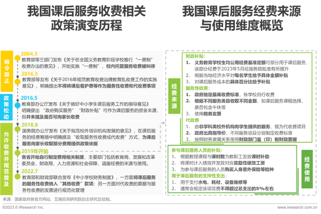 我国课后服务在收费问题上经历了从明令禁止到政策松动,最终发展至允许收费并规范普及的历程。其中尤其在2017年前后在能否收费的问题上经历了短时间内的大型调整,直到2018年政策正式为课后服务向家长收费提供政策依据。此后各省市教育局、发改委等部门逐渐开始结合本地经济发展情况,制定课后服务领域的费用相关制度。其中经费来源主要包括财政补贴、服务性收费与代收费,经费使用主要用于参与课后服务的人员补贴与支持性支出。