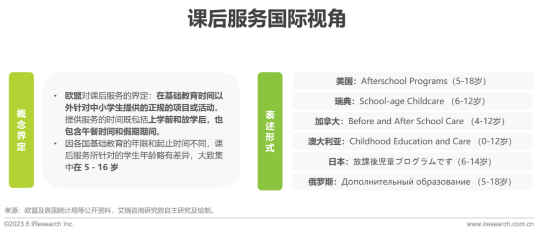 在国际和国内视角中,课后服务的内涵总体一致,指的都是在基础教育时间以外针对中小学生提供的服务或活动,但在具体服务对象和服务提供者上有所差异。从服务对象来看,加拿大、欧洲、澳大利亚更关注小学及之前的学龄儿童,美国、韩国、俄罗斯关注小初高的全年龄段,而中国和日本更关注义务教育阶段学生。从服务提供者来看,国际视角下课后服务的供给主体更加广泛,如美国一半的课后服务由公立学校以外的组织提供,英国、爱尔兰以校外机构供给为主,日本的社区力量贡献突出等。而当前中国课后服务仍以学校为主阵地和主渠道,普遍推行“5+2”的模式。由此,本报告国内部分的研究范围为以中小学校为主导、以义务教育阶段学生为主要对象开展的课后服务活动。