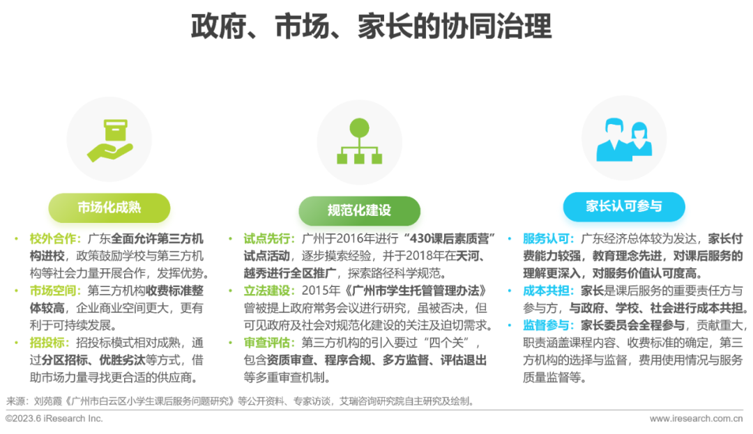 广东课后服务起步早,经过长期探索逐步确立现有模式,在全国处于领先水平,其优势和经验可概括为市场化成熟、规范化建设及家长认可与广泛参与三点。首先,处于东南沿海的广东,市场化本就比较发达。广东积极引进第三方机构进校,同时给予企业较大的市场空间,且招投标模式较为成熟;其次,经过多年的试点及推广、课后服务立法尝试以及多级审查评估机制建设等,广东课后服务的体系已较为规范化;更重要的是,广东的家长在课后服务的发展中起到了举足轻重的作用,从服务认可到成本共担再到全程的质量监督,家长与政府、市场一起做到了对课后服务的协同治理,共同推动了广东课后服务的高水平发展。
