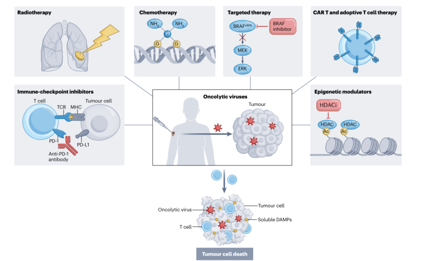 溶瘤病毒消除肿瘤细胞的机制与其他抗癌疗法的机制明显不同。因此,溶瘤病毒是与全身化疗,免疫疗法,靶向疗法、放疗其他治疗方式联合使用的合理候选者。此外,溶瘤病毒的毒性特征有限,通常不会与其他治疗方法相关的毒性重叠。而且,临床前模型的数据表明,当与其他全身疗法(包括化学疗法和细胞疗法)联合使用时,溶瘤病毒的抗肿瘤活性得到改善。