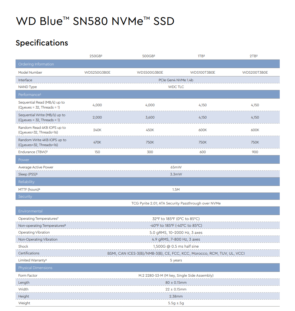 它的 2TB 版本写入耐用性提供了 900 TBW,250GB 的版本也有 150TBW,还算合适;至于这款硬盘使用了什么颗粒和主控目前不得而知,或许会跟 SN570 一样是 TLC 颗粒。