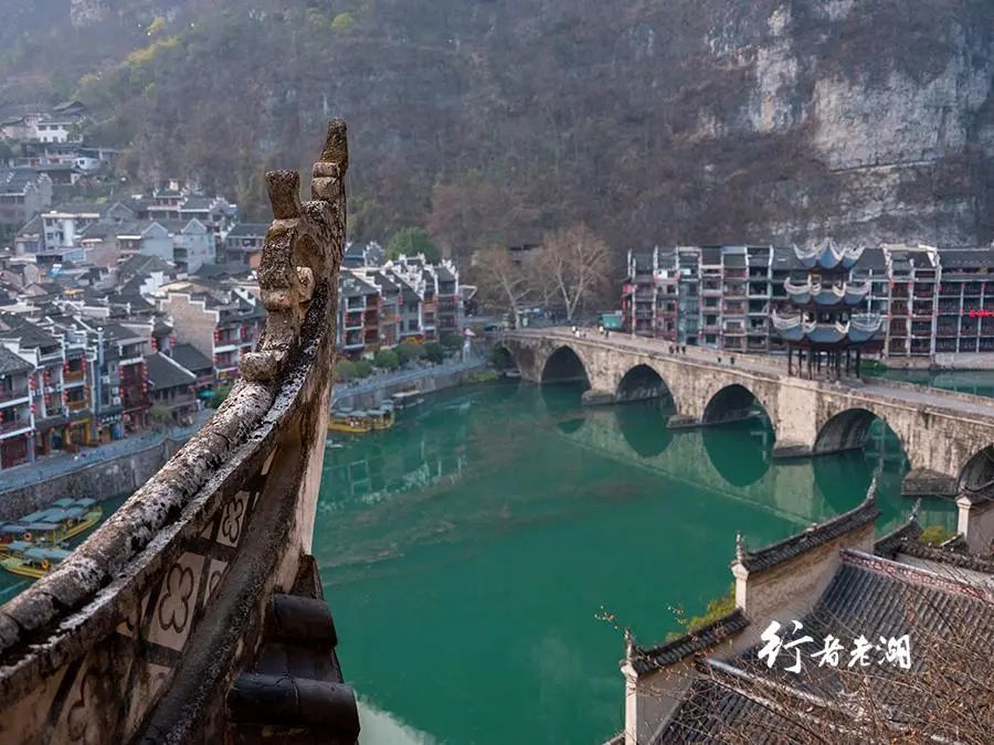 去青龙洞,先要走过祝圣桥,彷佛是跨过一道神圣的门槛。135米的石拱桥横跨绕城的舞阳河,桥中央是座中式亭阁 — “魁星亭”,像是皇冠上的明珠。从半山高处俯瞰古桥,下方宁静水域一片碧绿。