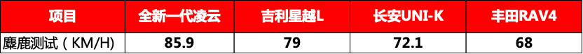 在最能说明驾控的麋鹿测试项目中,星途凌云以85.9KM/h的成绩成为四车中最优秀的一个,同时也是唯一超过80KM/h的车辆。