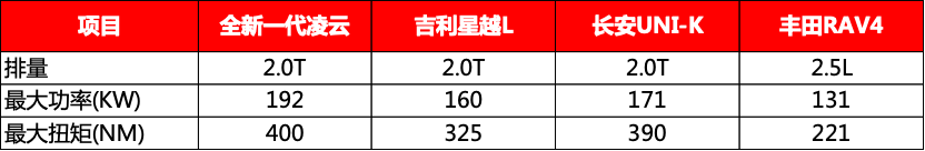 全新一代凌云、吉利星越L和长安UNI-K都搭载1.6T和2.0T的发动机,丰田RAV4则是使用的2.0L和2.5L自然吸气的发动机。我们就拿2.0和2.5的进行对比。