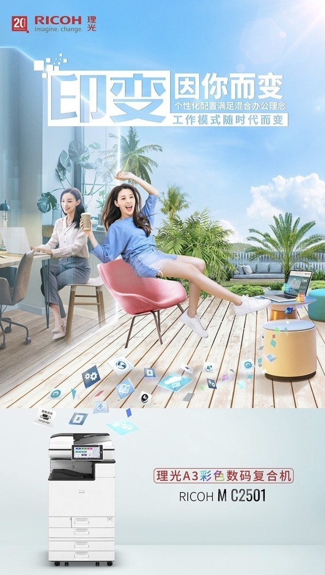 “印变·因你而变”是RICOH MC2501予以数字化时代办公模式的宣言,将传统办公文印引领入门至数字化时代,让混合办公的理念真正落于实处。以人为核心,因人而变化,可实现因人而异的灵活设置。以时代为契机,因时代而变化,整合数字化生态的多种混合办公空间,支持办公室和远程工作方式,不受距离束缚的办公模式。以环境为载体,因位置而变化, 随时随地开展办公,不受空间束缚,无论是办公区域,又或是数字游民可能出现的任何地点,一台RICOH MC2501即可突破物理时空,驱动多场景混合办公空间。