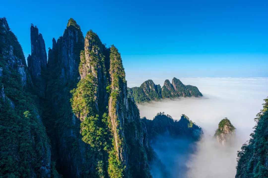 宜章县境内的莽山,是湘粤两省的分界,对面就是广东的韶关。莽山是地球同纬度最大的一片原始森林,为“中国原始生态第一山”。乘缆车抵达山岭,沿着栈道、石板路漫步穿梭于五指峰、猴王寨、将军寨、天台山,林海莽莽,奇峰叠翠,溪涧纵横。