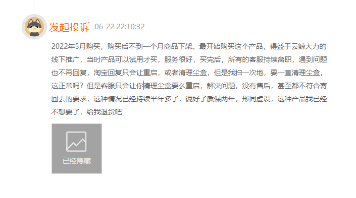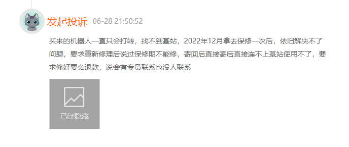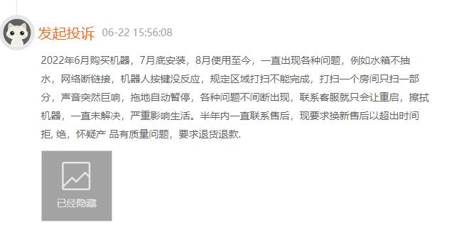 还有消费者反映云鲸售后得不到保障,“说好了质保两年,形同虚设”“客服只会让你清理尘盒要么重启”。