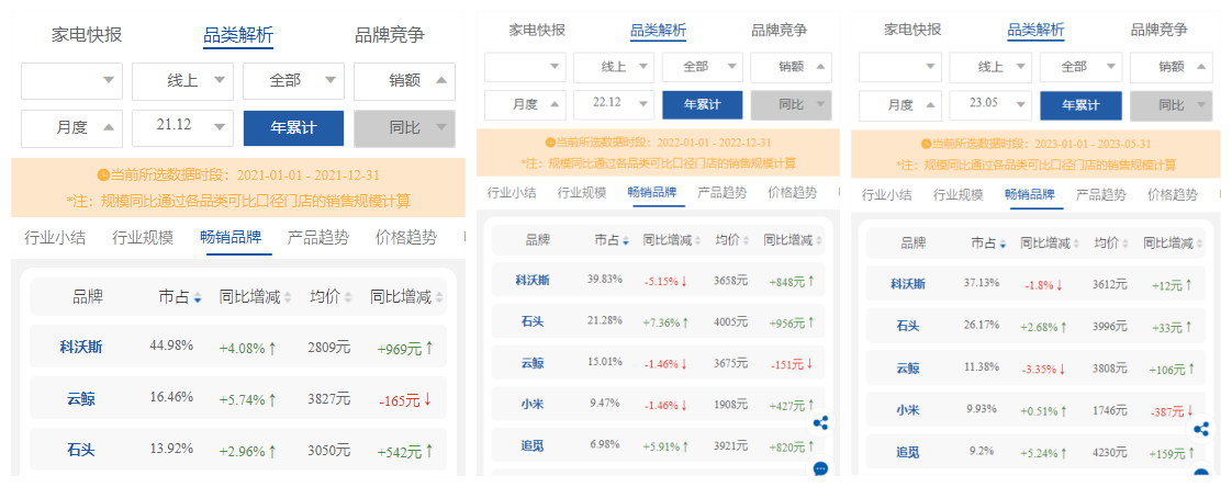 值得注意的是,云鲸2021、2022、2023年的在线上市场的市占率分别为16.46%、15.01%、11.38%,逐年下跌。在线下市场,云鲸占有率几乎都不到1%,短板明显。