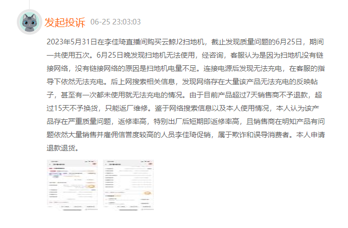 有消费者称,云鲸扫地机器人问题频出,“连接电源后发现无法充电”“出厂后短期即返修率高”。
