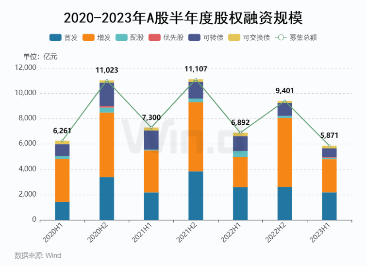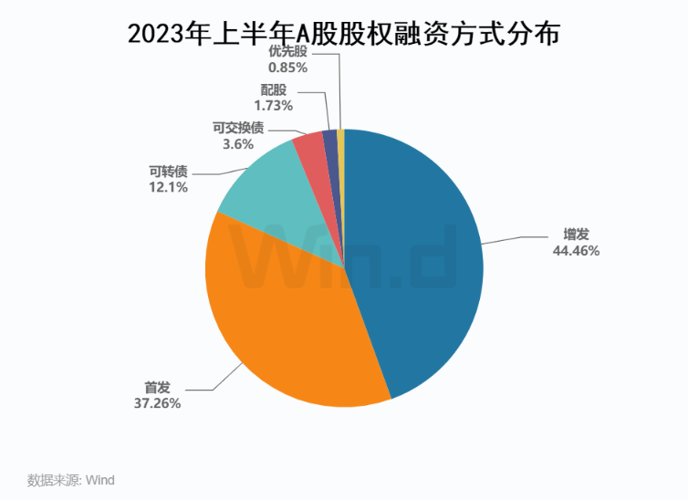 具体从各个融资方式来看,2023年上半年IPO发行184起,募资规模为2,188亿元,占比为37%;增发发行131起,募资规模达2,610亿元,占比达44%;可转债发行53起,募资规模710亿元,占比为12%;配股发行2起,募资规模101亿元,占比为2%;优先股发行1起,募资规模50亿元,占比仅1%。