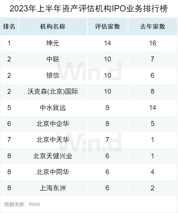 从资产评估机构榜单来看,坤元资产评估有限公司以14家评估家数继续位居榜单第一。中联资产评估集团有限公司、银信资产评估有限公司和沃克森(北京)国际资产评估有限公司均评估10家,并列第二名。