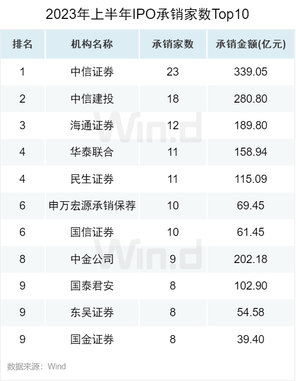 从IPO承销数量来看,中信证券以23起承销数量排名第一,排名第二的是中信建投,承销数量为18起。海通证券排名第三,承销家数为12起。