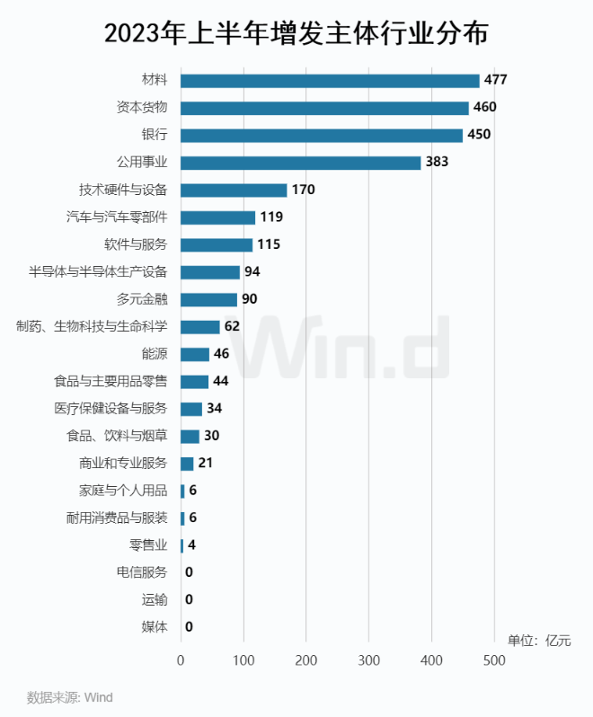从增发行业分布来看,材料、资本货物和银行业募资金额处于领先地位,分别募资477亿元、460亿元、450亿元。公用事业行业增发募资额为383亿元,位居第四名。