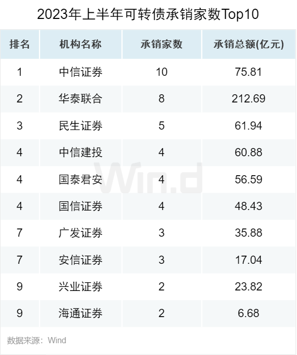 从可转债承销数量来看,中信证券和华泰联合分别以10起和8起的承销数量位居第一和第二,排名第三的是民生证券,承销数量为5起。
