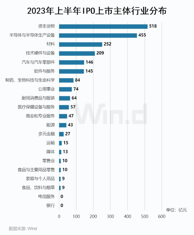 从主体行业维度看,IPO募资规模排名第一的是资本货物行业,募资金额518亿元,募资家数47家;排名第二的是半导体与半导体生产设备行业,募资额为455亿元,募资家数16家。材料行业以252亿元的募资金额排名第三,募资家数为29家。
