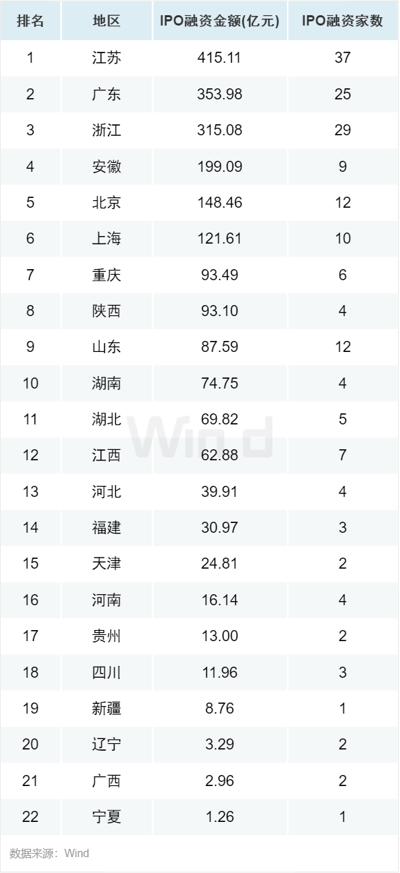 从地域分布来看,江苏以415亿元名列IPO募资规模排行榜第一,首发数量为37起。广东和浙江分别以354亿元和315亿元的募资额位居第二和第三,IPO募资数量分别为25起和29起。排名第四的是安徽,以9起IPO募资199亿元,主要得益于募资额近100亿元的晶合集成项目。